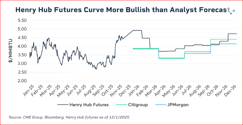 Los operadores de gas natural seguirán de cerca el progreso de los proyectos de GNL estadounidenses que ya se encuentran en fase de puesta en marcha, así como los que se espera que entren en funcionamiento en 2026 y 2027. La expansión del GNL significa grandes aumentos en la demanda de gas de alimentación en Estados Unidos, y cualquier retraso en el crecimiento esperado de la demanda de gas de alimentación podría afectar los precios de los futuros de Henry Hub, que se han disparado a más de 4,70 dólares/mmbtu en diciembre de 2025.