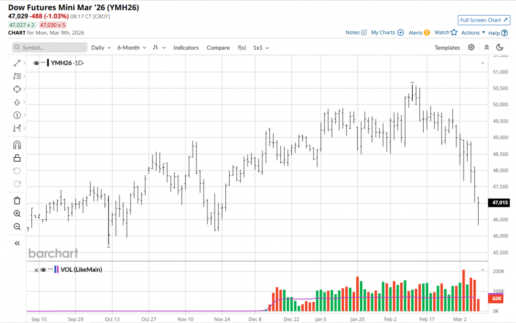 Los futuros del crudo West Texas Intermediate (CL=F) cotizaban alrededor de 103 dólares por barril, mientras que los futuros del Brent (BZ=F), el referencial mundial, cotizaban por encima de los 107 dólares. Ambos subieron aproximadamente un 15%. La ola de ventas de acciones se produjo tras una racha desastrosa la semana pasada, en la que el Dow Jones (^DJI) perdió aproximadamente un 3%, marcando su caída semanal más pronunciada desde que las preocupaciones arancelarias de la administración Trump sacudieron los mercados en abril de 2025. El S&P 500 (^GSPC) cayó alrededor de un 2%, mientras que el Nasdaq Composite (^IXIC) cerró con una baja de más del 1%.