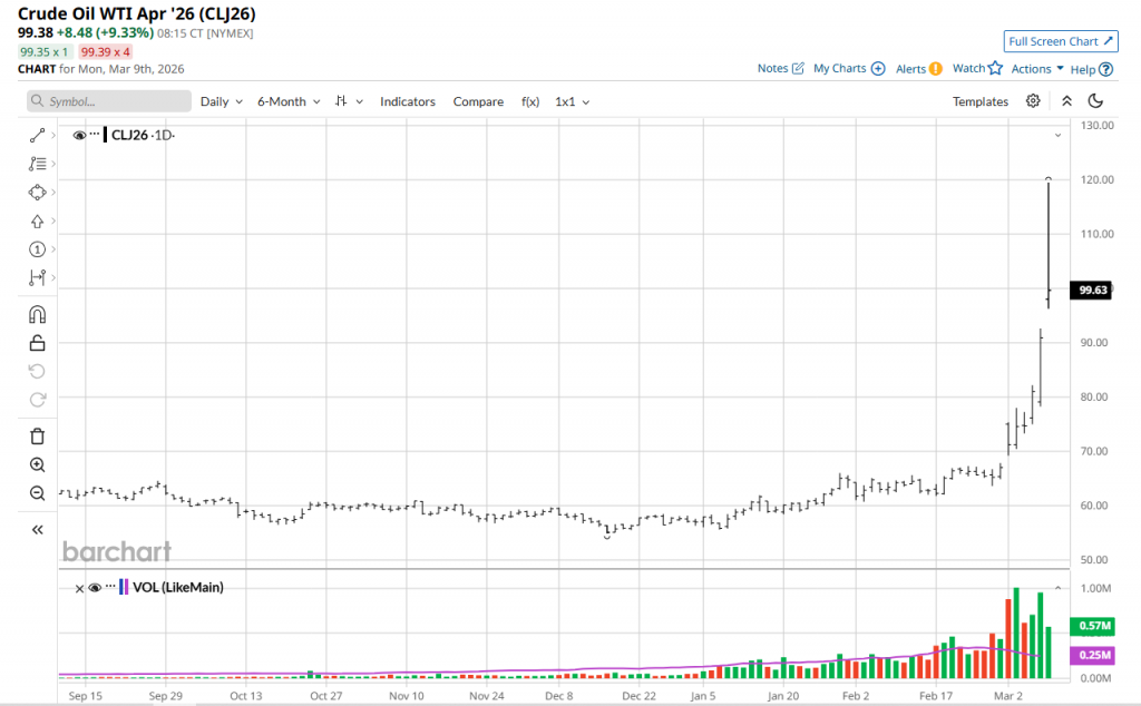 Los precios del petróleo se alejaban de sus máximos previos tras dispararse alrededor de un 25% el domingo por la noche, superando los 119 dólares por barril, alcanzando niveles no vistos desde 2022. El repunte se produjo cuando el conflicto en Irán impulsó a los países productores de crudo a recortar la producción, ya frenada por el cierre virtual del corredor marítimo del Estrecho de Ormuz. Kuwait confirmó recortes de producción no especificados, mientras que se informa que la producción iraquí se desplomó alrededor de un 70%.